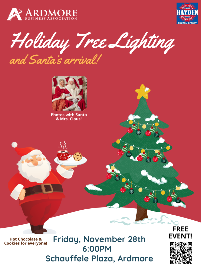 Join us for a festive evening in the heart of Ardmore as we welcome Santa’s arrival on a fire truck and light up our community tree! This FREE event, sponsored by the Ardmore Business Association, will feature hot chocolate, cookies, and photos with Santa & Mrs. Claus.