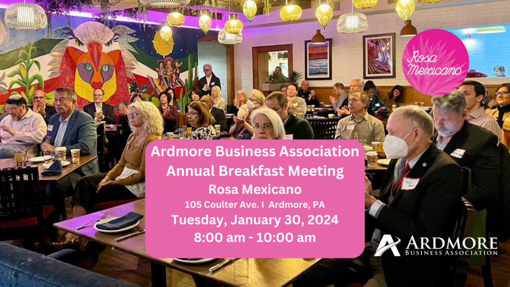 Join us for an engaging morning at the Ardmore Business Association Annual Breakfast! Delight in a delectable breakfast spread while discovering the essence of ABA and its impact on the Ardmore community. Hosted at the charming Rosa Mexicano in the heart of Suburban Square, this event offers a perfect opportunity to network, share ideas, and forge new connections.